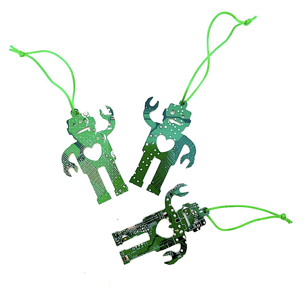 For the robot and computer enthusiast in your life. Perhaps, that's you! This robot ornament is cut from a green circuit board with the aid of a computer controlled routing machine. Sold Individually.
