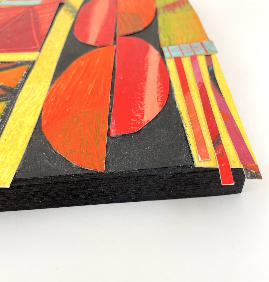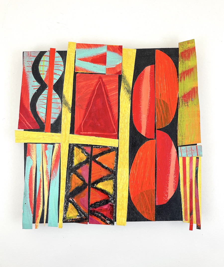 A bold design with collaged strips of saturated red, carmine and chartreuse. Playful mark-making accentuated by the rich black background.