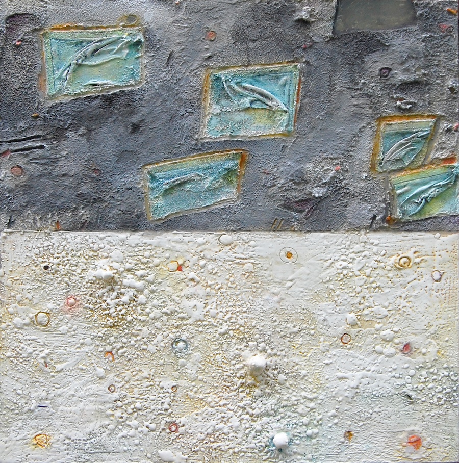 A subtle and complex play of color and encaustic texture combine to create a color block field imprinted with lines and symbols that promise to surprise and intrigue the viewer.
