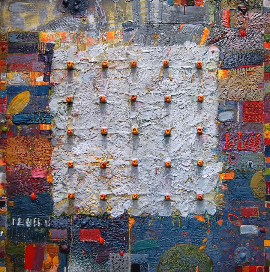 A subtle play of color and encaustic texture combine to create a complex and pleasing color block field with collage and ephemera promises to surprise and intrigue the viewer.