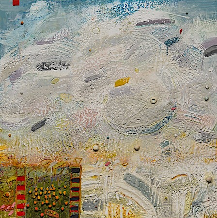 A subtle and complex play of color and encaustic texture combine to create a color block field imprinted with lines and symbols that promise to surprise and intrigue the viewer.