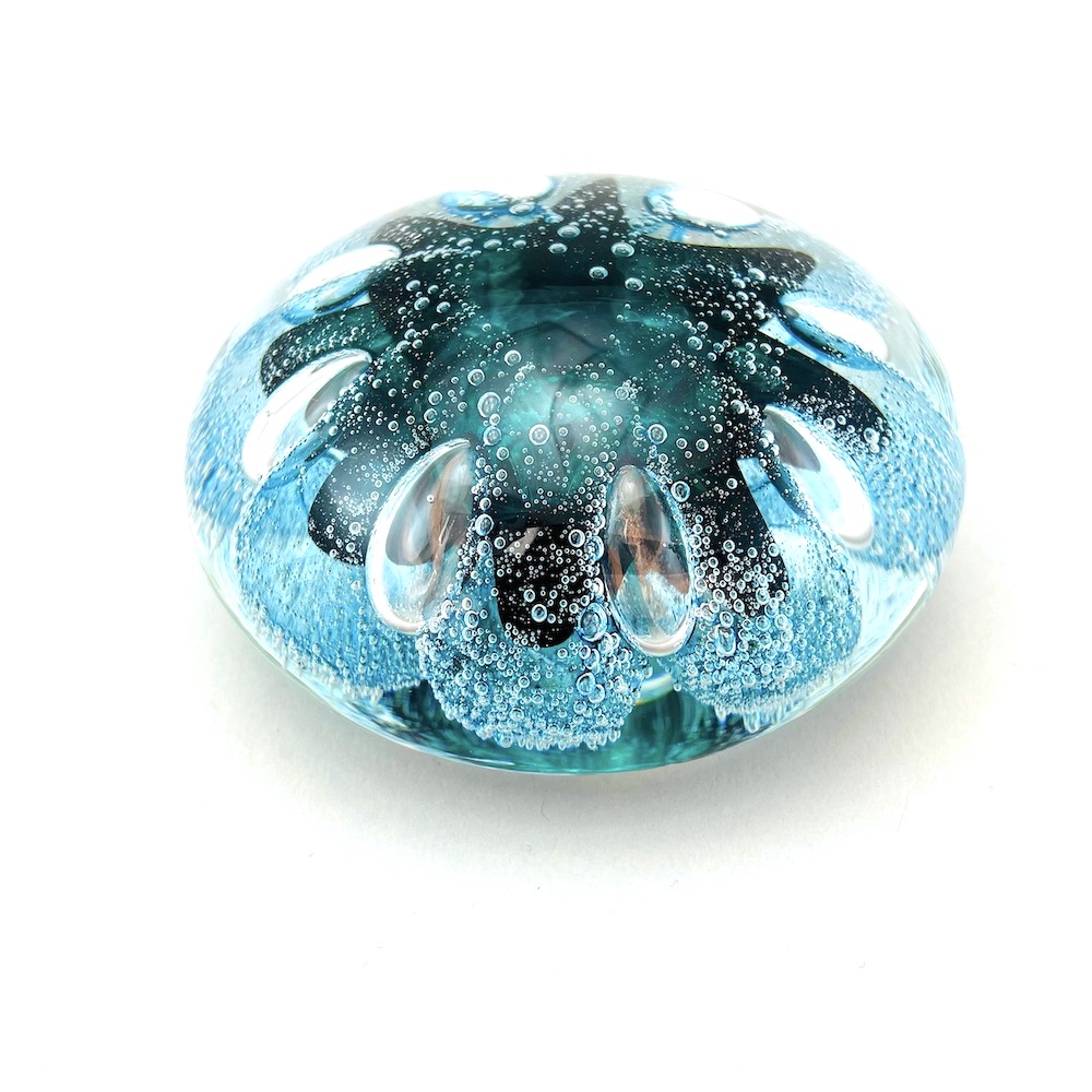 This glass paperweight captures the pattern of a sea urchin or starfish. The bubbles create the illusion of the underwater environment and evoke the mystery found within the sea. Hefty in weight with a supremely smooth surface. Place on a solid surface, a window sill or a light base to bring the depth of color to life.