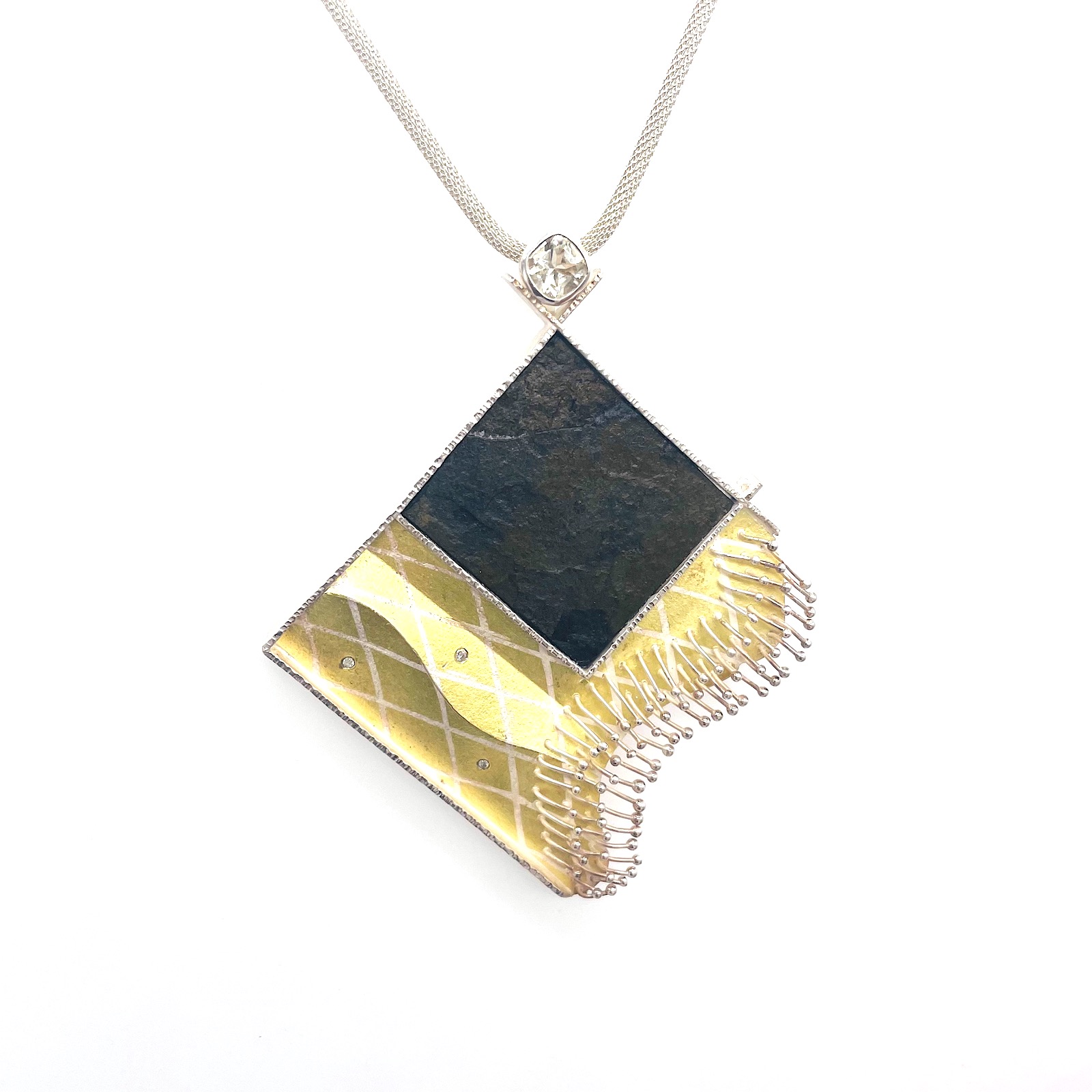 This sculptural pendant is bold in design and rich in detail. A main focal point is textuted black slate set in Sterling silver. Above is a bevel set citrine and below, an undulating field of 18K gold kumbo over Sterling silver. Three diamonds sparkle from the field with a series of undulating Sterling tendrils along the edge.