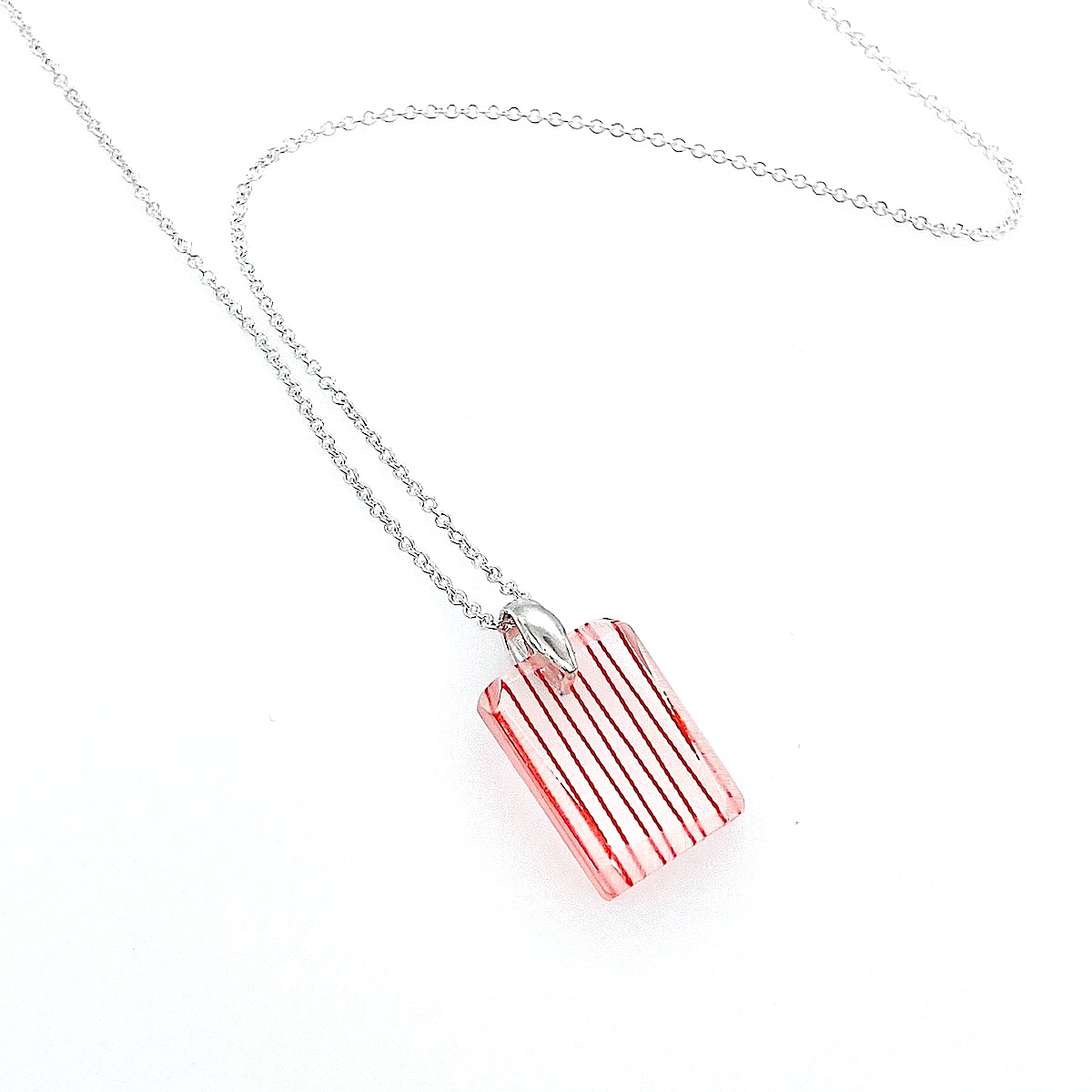 A rectangular and hand polished faceted resin necklace is cast with red silk thread to create a contemporay and fun-to-wear pendant. The textured faceted edges reveal interesting detail.