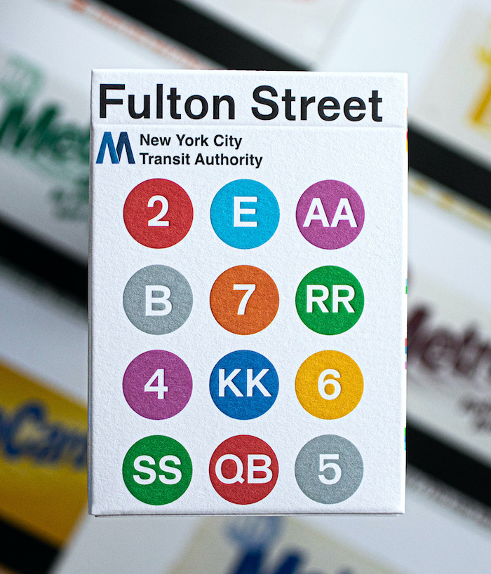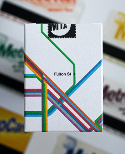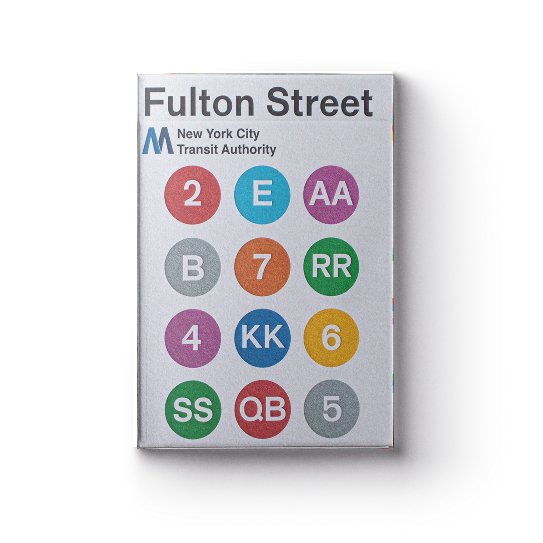 These classic playing cards feature custom back and face card designs that celebrate the now legendary signage of the most frequented transit system in the USA. Produced in collaboration with the MTA, Fulton Street is a love letter to the amazing graphic design of the New York Metropolitan Transportation Authority. By “cropping into” the curves so eloquently designed by Lella and Massimo Vignelli, these cards provide a back design that encapsulates the kinetic energy of transit in The Big Apple.