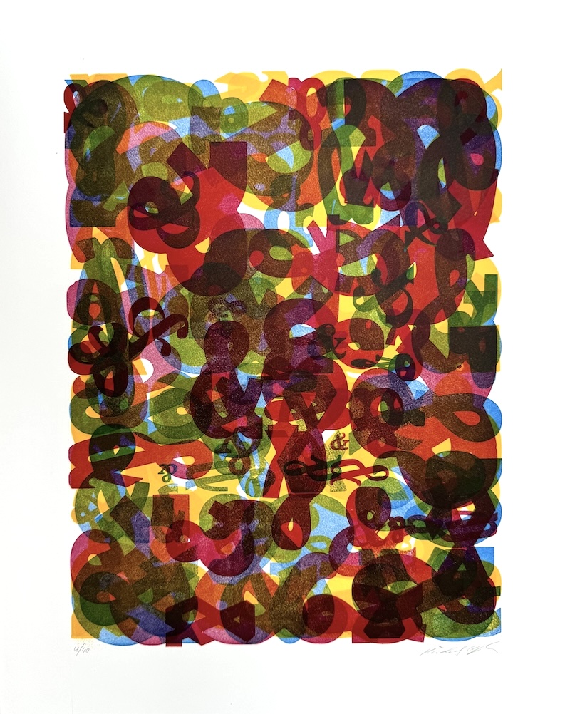 Using dozens of vintage wood type Ampersands, this print was hand printed on a Vandercook SP-20 press with Cyan, Magenta and Yellow ink. There are 6 passes through the press, 2 for each color, and a different arrangement of Ampersands for each pass. Some parts of the print have 6 colors and some have white peeking through.