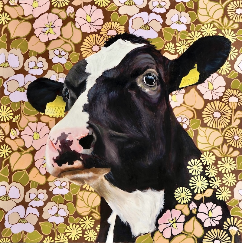 A masterfully detailed illustration that melds a graphic and an organic style. Pairing the cow portrait with a decorative background generates a unique visual relationship.