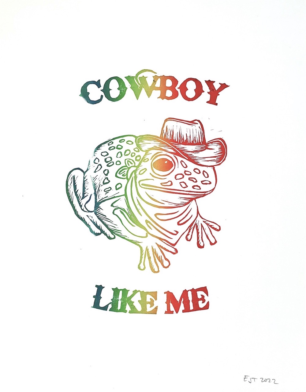 An original linocut print of a cowboy frog by Emily Tyman. This rootin' tootin' cowboy bootin' print is hand-printed in a vibrant rainbow, with a slightly unique color variation in each print. This print is sure to please frog lovers and cowboys alike!