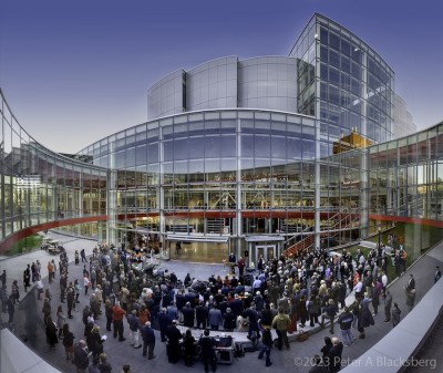 A striking panoramic photographic image of RIT's architectural gem - The SHED. Peter Blacksburg photographed the building during the ribbon cutting ceremony and presents this clear, saturated print.