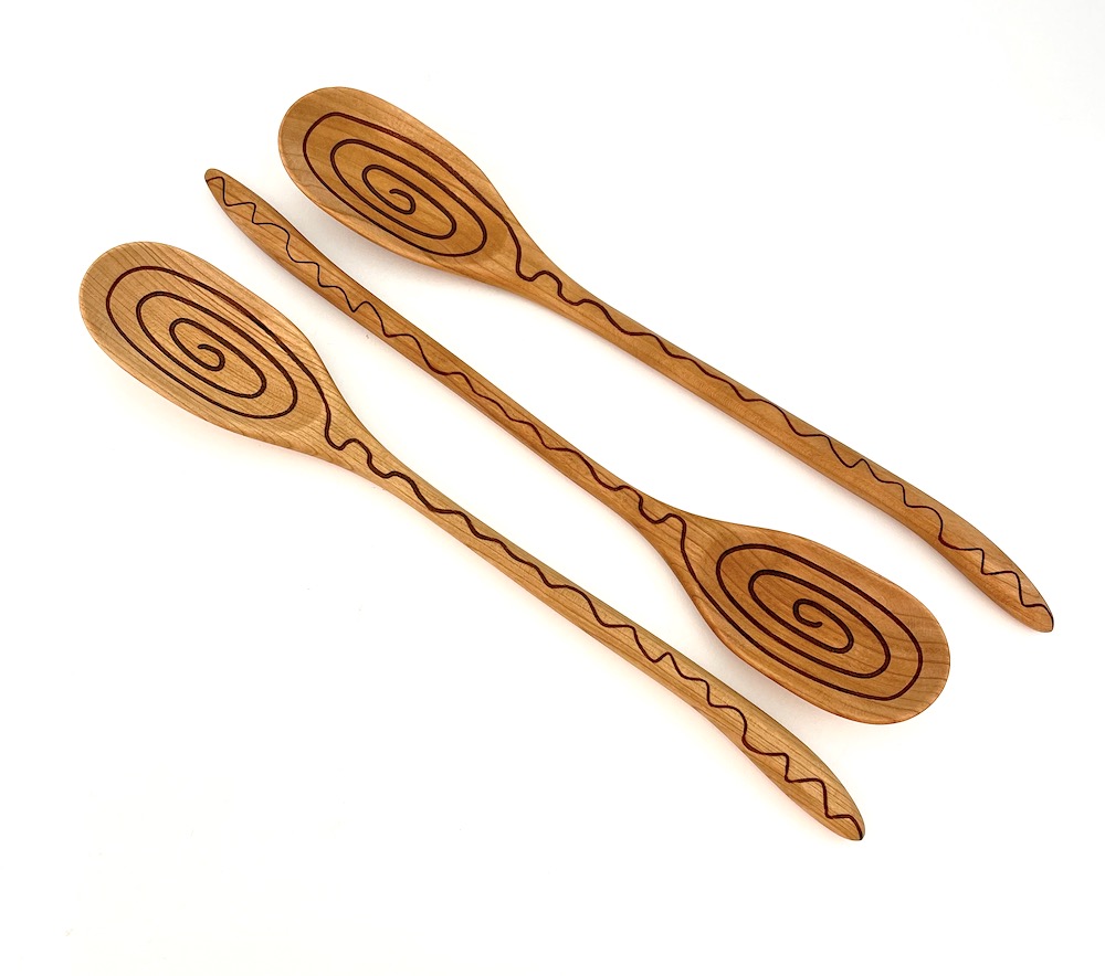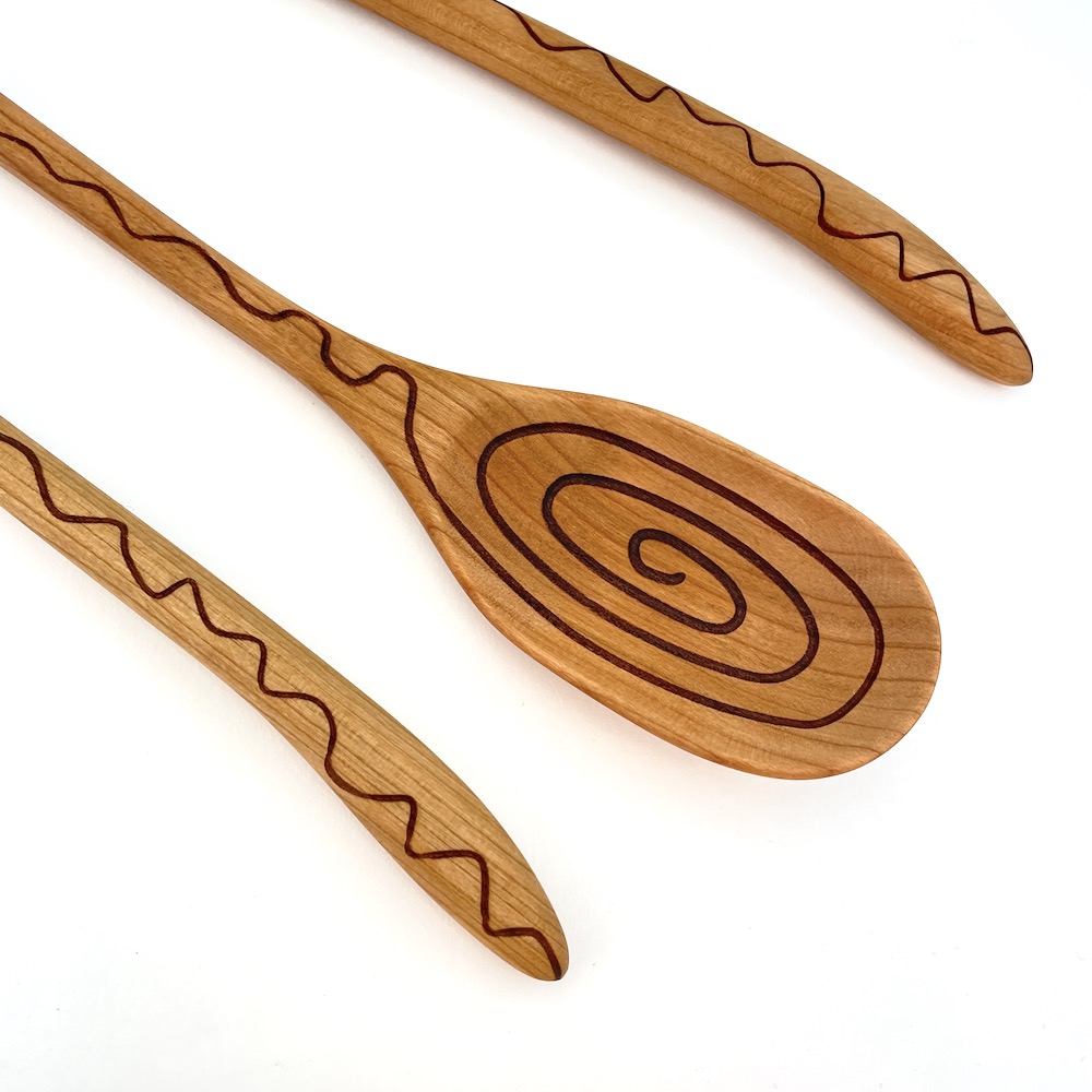 This handmade cherry wood spoon sports progressive circles signifying growth and balance in a world gone crazy. Bring this beautiful and useful object into your home or to thoughtfully gift. Sold individually.