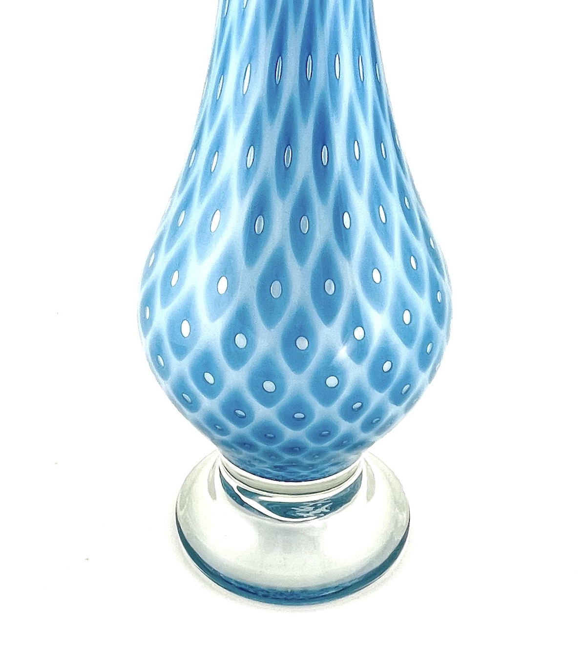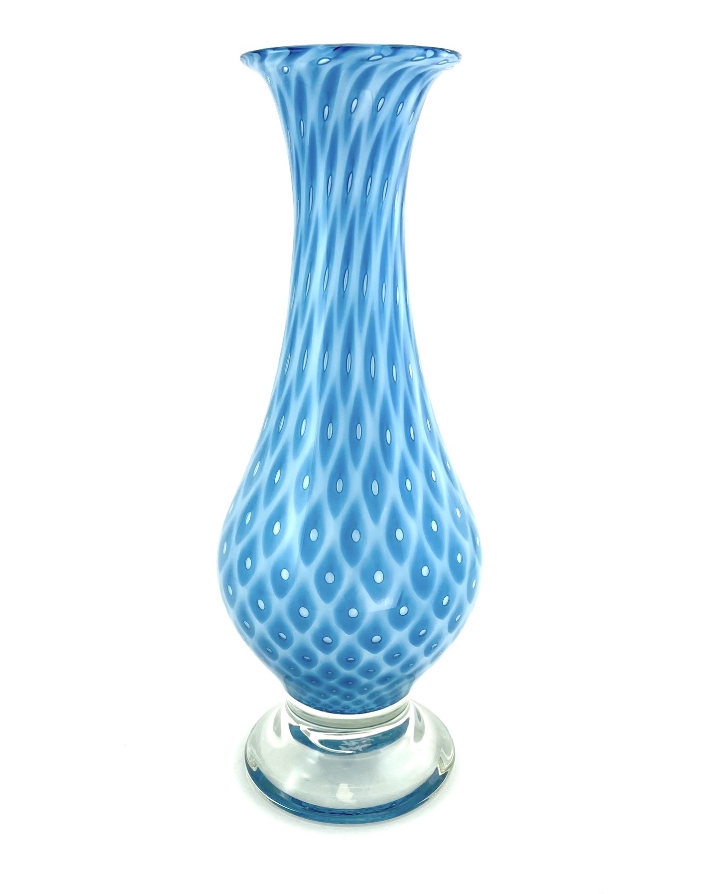 This vase has a traditional teardrop shape featured on a clear glass footed base. Individual bubbles are masterfully nestled in each diamond to bring a new look to this classic form. A weighty and impressive piece.