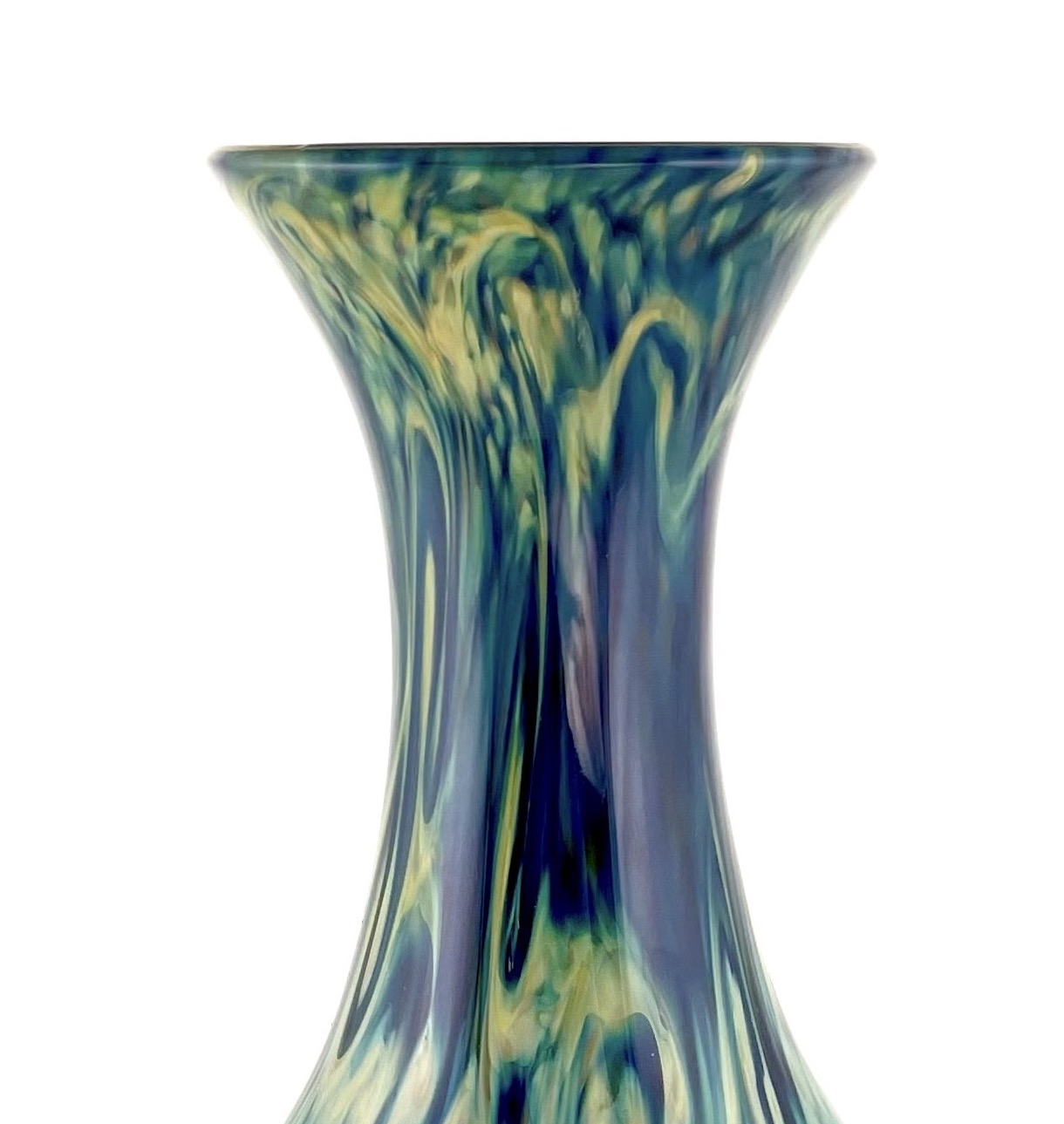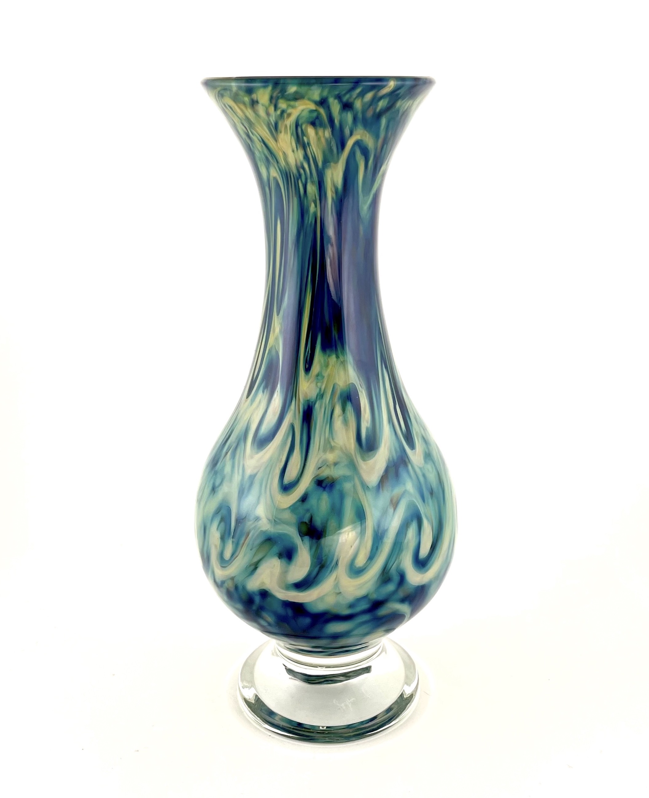 This vase has a traditional teardrop shape featured on a clear glass footed base. Individual bubbles are masterfully nestled in each diamond to bring a new look to this classic form. A weighty and impressive piece.