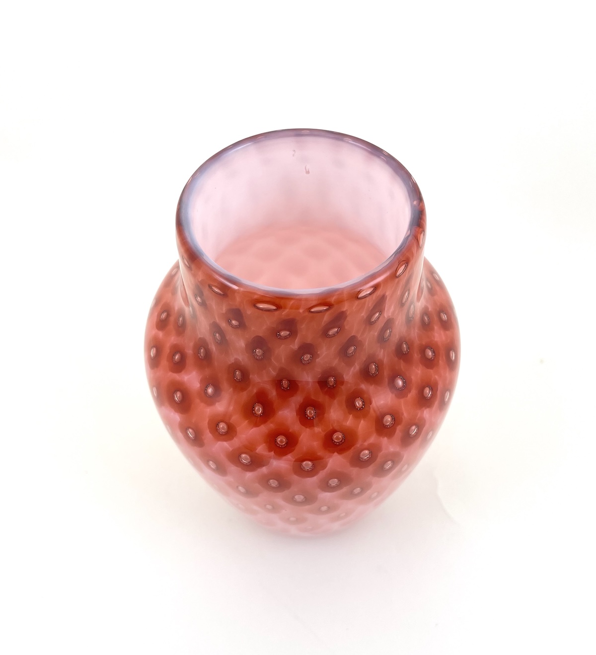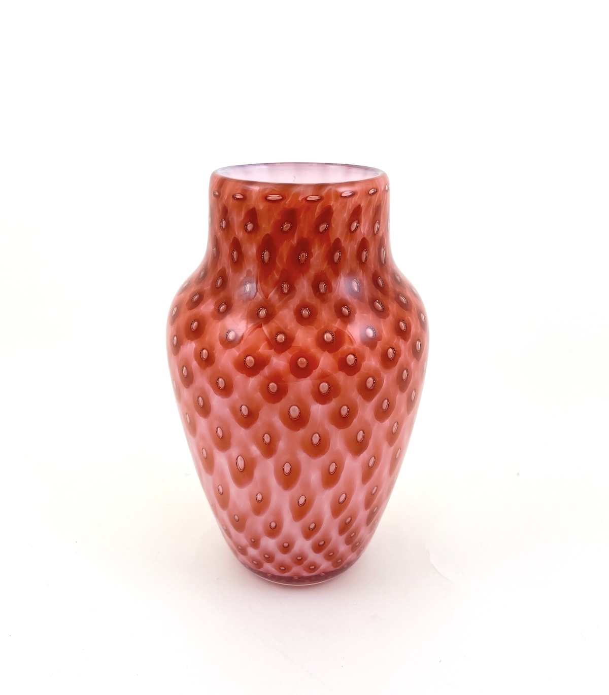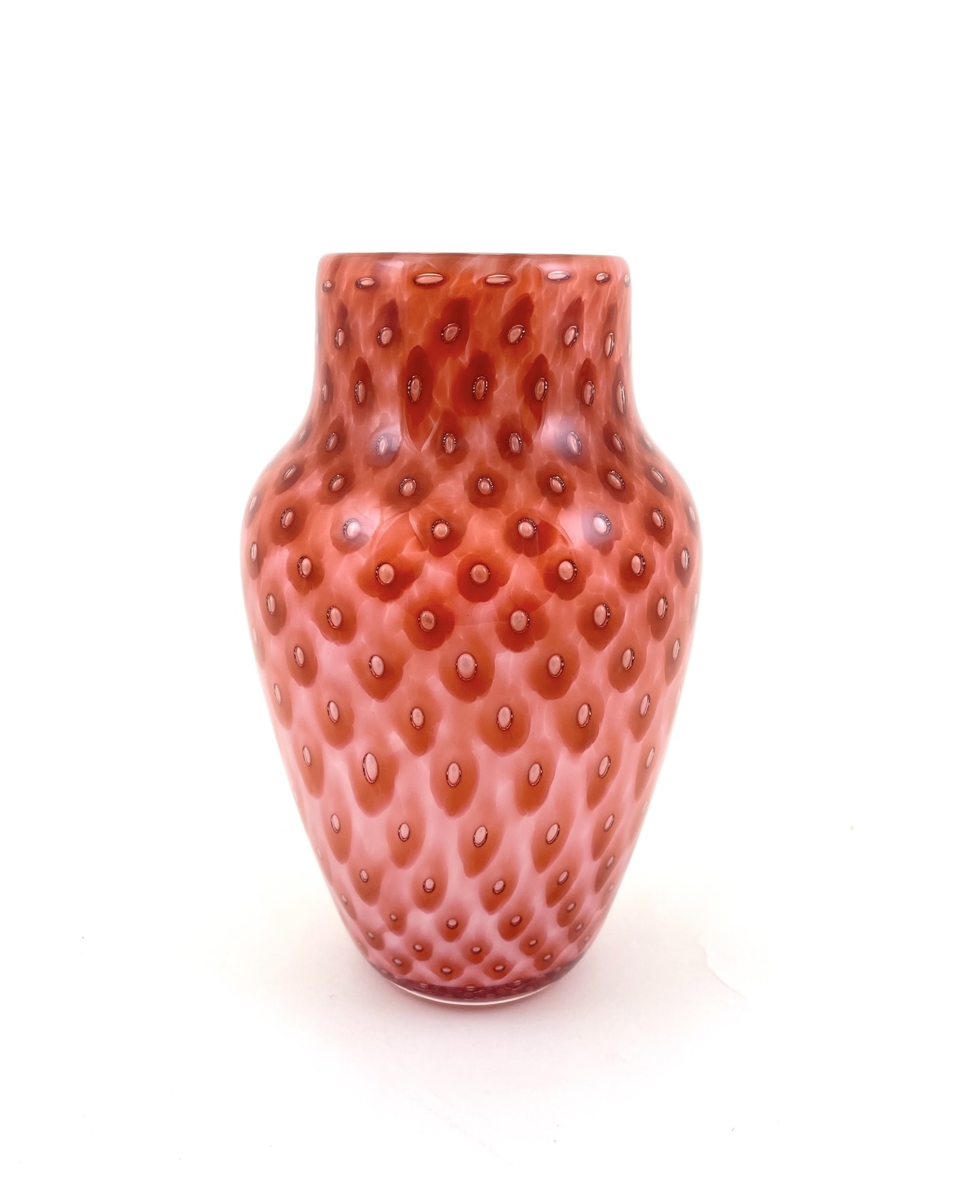 This elegant handblown glass vase evokes a bit of mystery with its rich color palette of strawberry tones highlighted with an optic stripe pattern. Useful as a vase or a stand alone sculptural piece.