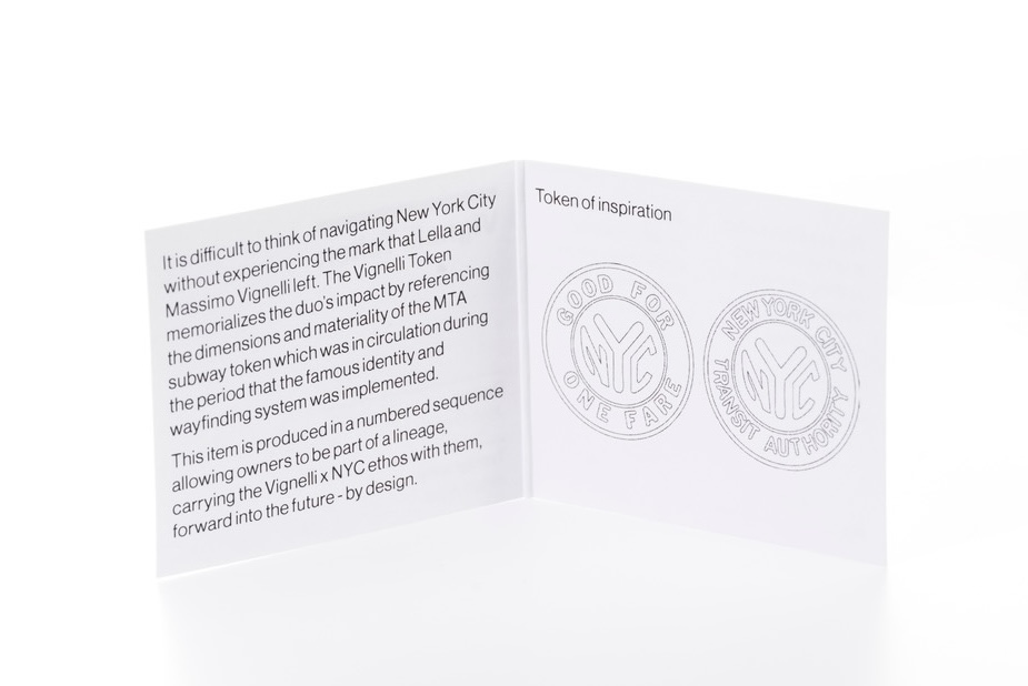 It is difficult to think of navigating New York City without experiencing the mark that Lella and Massimo Vignelli left. The Vignelli Token memorializes the duo's impact by referencing the dimensions and materiality of the MTA subway token which was in circulation during the period that the famous identity and wayfinding system was implemented.