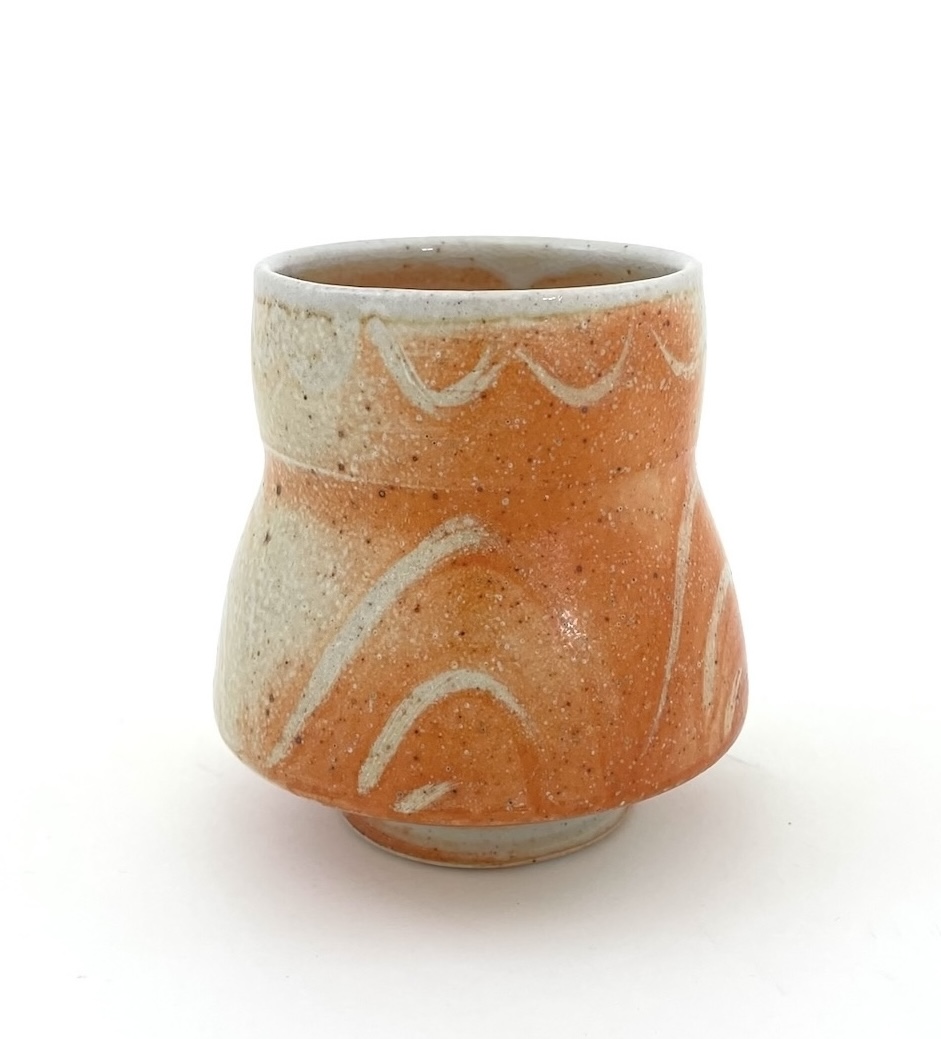 A yunomi (Japanese: 湯のみ) is a form of teacup, typically made of ceramic with a trimmed or turned foot. This one-of-a-kind yunomi has a lovely terraced form with a burnished brick hued glaze accentuated with a grey slate gloss glazed decorative motif and interior.