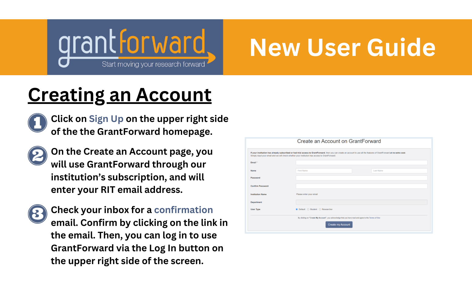 Start moving your research forward and create an account to access GrantForward. In order to be able to take advantage of all of the features that GrantForward offers, you will have to create an account using your RIT email address.