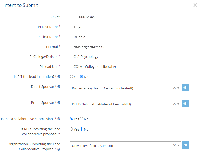 RIT is the lead institution if we are responsible for submitting the full proposal to the sponsor. When RIT is not responsible for submitting the full proposal, the Direct Sponsor is the entity that provides funding directly to RIT while the Prime Sponsor is the organization with the original source of the funding.