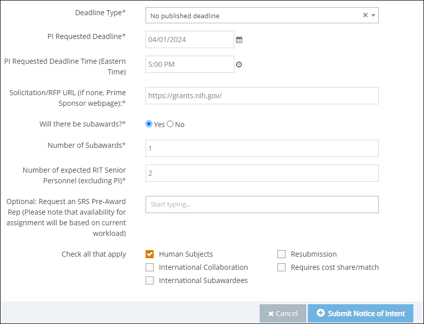 If any changes occur after the NOIS form is submitted, communicate these changes to your SRS Pre-Award Representative.