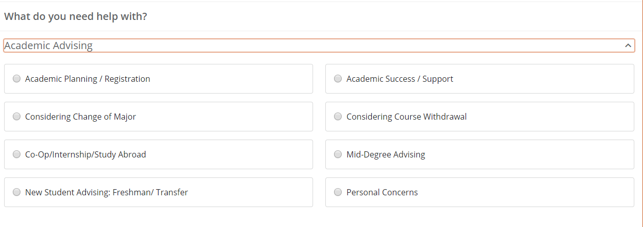 - Select Academic Advising and choose a reason from the list, and click Continue.