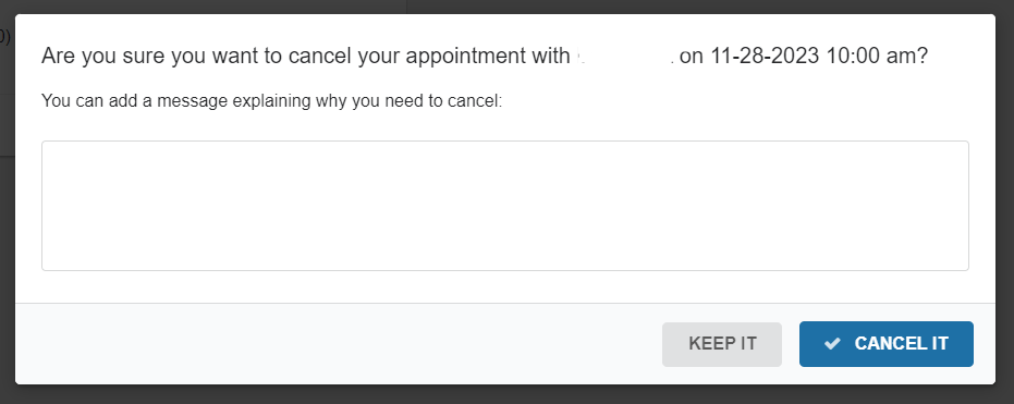 - Another window will open allowing you to send a message detailing why you are canceling the appointment. Include any information you want and press the Cancel It button.