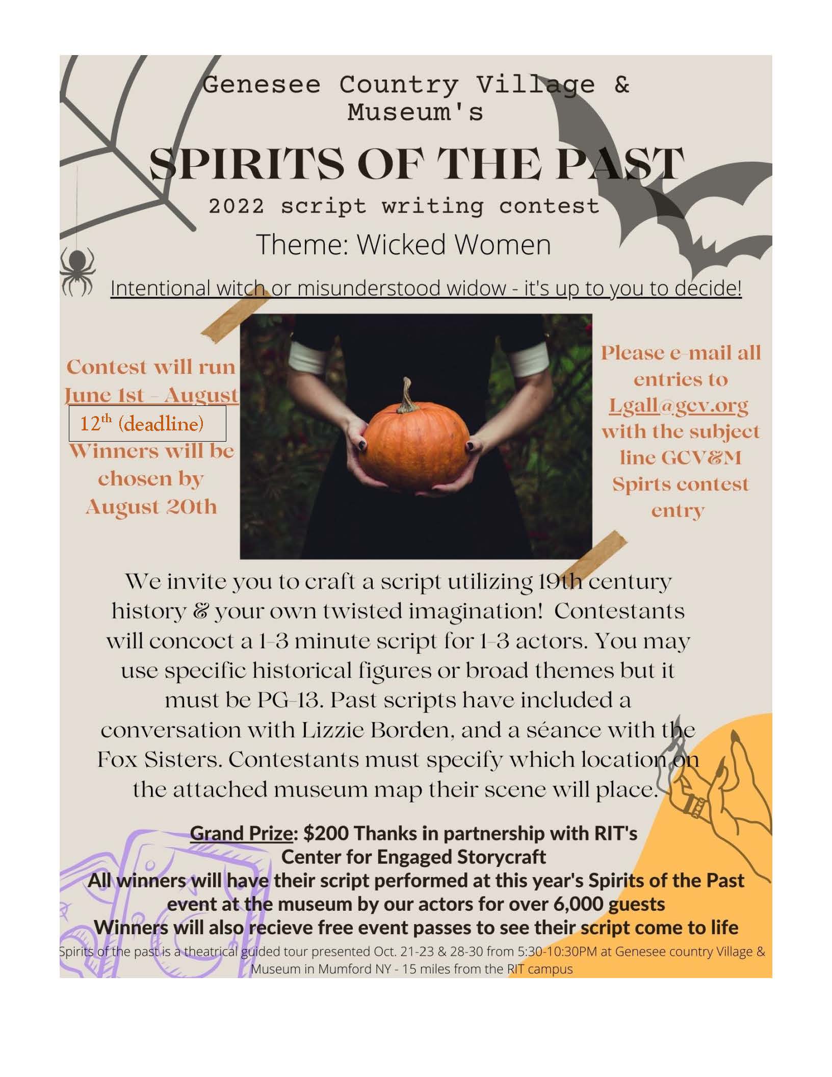 Try your hand at writing the script for a 1-3 minute story (for 1-3 performers) in this unique 'Stories of the Past" Script Writing contest sponsored by the Center for Engaged Storycraft and the Genesee Country Village and Museum. Winning scripts will be performed on site at the Spirits of the Past event and winning contestants will also receive a cash prize. You do NOT have to be an RIT student to compete.