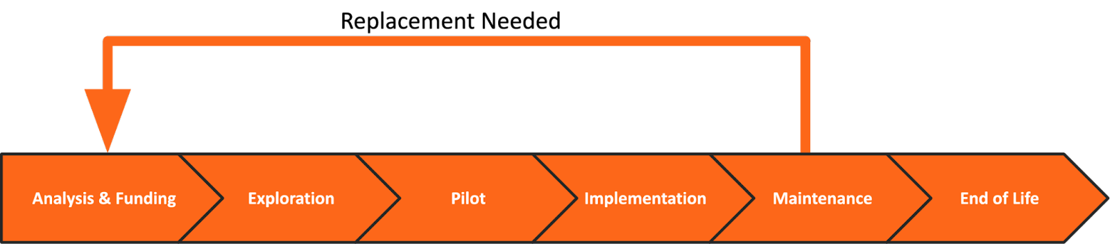 In addition to the time it takes to learn tools so that we can support your teaching work, "support" also means that the tool has been through our selection process and has met all criteria in the academic technology life cycle. This includes security audits that conform to RIT’s information security policies and accessibility audits that conform to WCAG 2.2 AA. We are committed to supporting tools that can help all instructors at RIT. There are many interesting technologies that may serve an entire college but don’t rise to the level of university-wide interest or relevance. Conversely, there may be a technology that is first adopted selectively within a specific college. The use cases generated in that limited adoption suggest that a life cycle evaluation by the instructional technology group within the CTL may be warranted. The goal of this life cycle evaluation is to rapidly determine the level to which a technology warrants broad adoption by RIT’s community. Just as important is the framework we have in place that helps us understand when a tool may no longer be useful or relevant for RIT. What follows is a description of our academic technology life cycle.