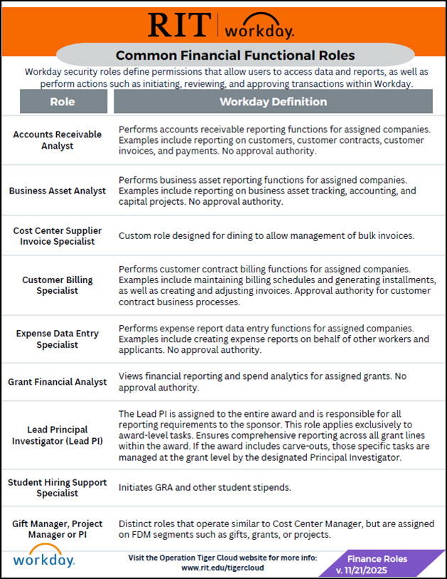 Descriptions of commonly-assigned finance functional roles in Workday.