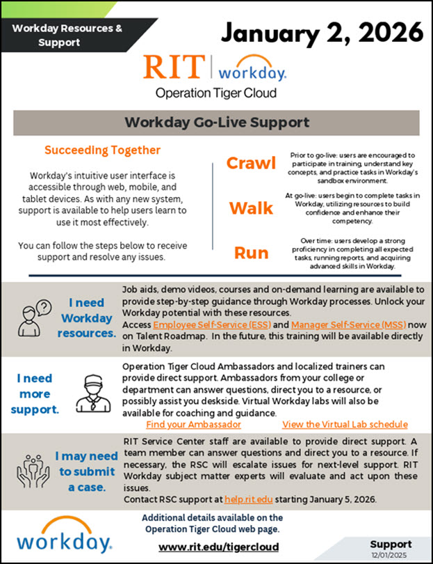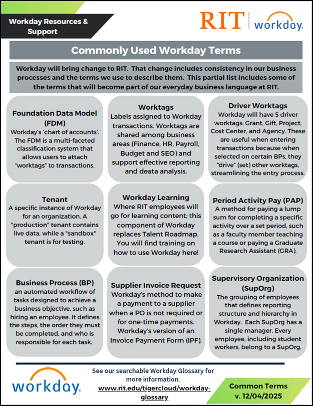 These handouts will help you get aquainted with some of the new terminology used in conjunction with Workday, some tips to navigate and search within Workday, and understand some of the basic tasks and functionality available in Workday.