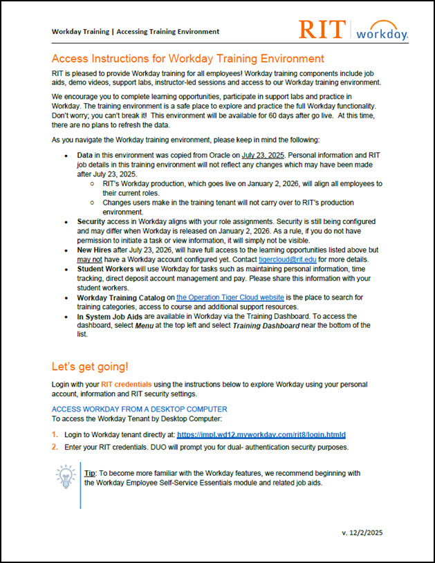 This file provides some guidance to about access to and use of the Workday training tenant. The training tenant will be available through 60 days post go-live.