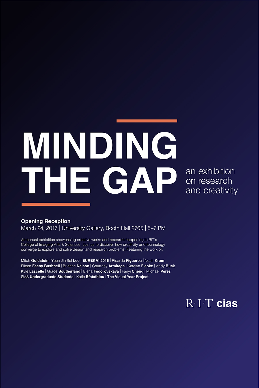 University Gallery hosts Minding the Gap: an exhibition on research and creativity that singles out one faculty member, one graduate and one undergraduate student from each of the College of Imaging Arts and Science's schools, in addition to a recent project by the Imaging Permanence Institute. This exhibition presents a diverse range of projects that interweave elements of research in art, design, and science.