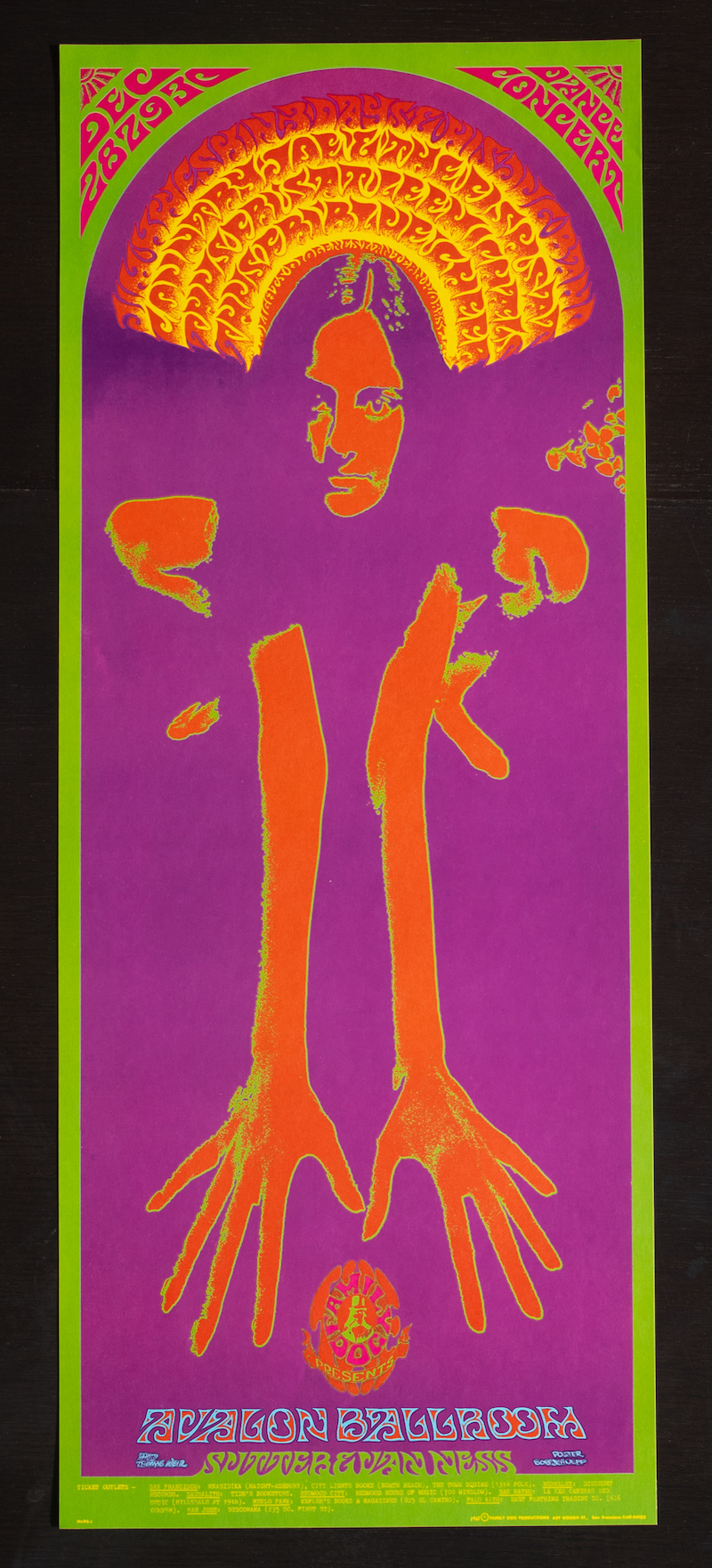 Immerse yourself in the art and music of San Francisco, 1967. During this pivotal era, psychedelic music was born and poster art flourished. The poster art in the exhibition represents a snapshot of this historic period and the emergence of the counterculture. Stylistically, the vibrant colors, swirling text, and surrealistic imagery draw from the past, while simultaneously embody its moment in time. Today's audience can glimpse into this generation's community and their freedom of exploration. They will also relate to the struggle for social change that continues today.