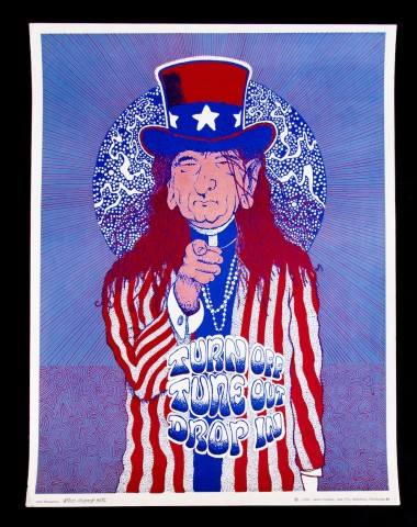 a poster in red, white and blue with a stylized 'Mr. Sam' like image of a man in a red and white striped coat, love beads, a large red top hat with a blue band with white stars, holding a cut out face of LBJ. Text 'turn on, tune out, drop in'.