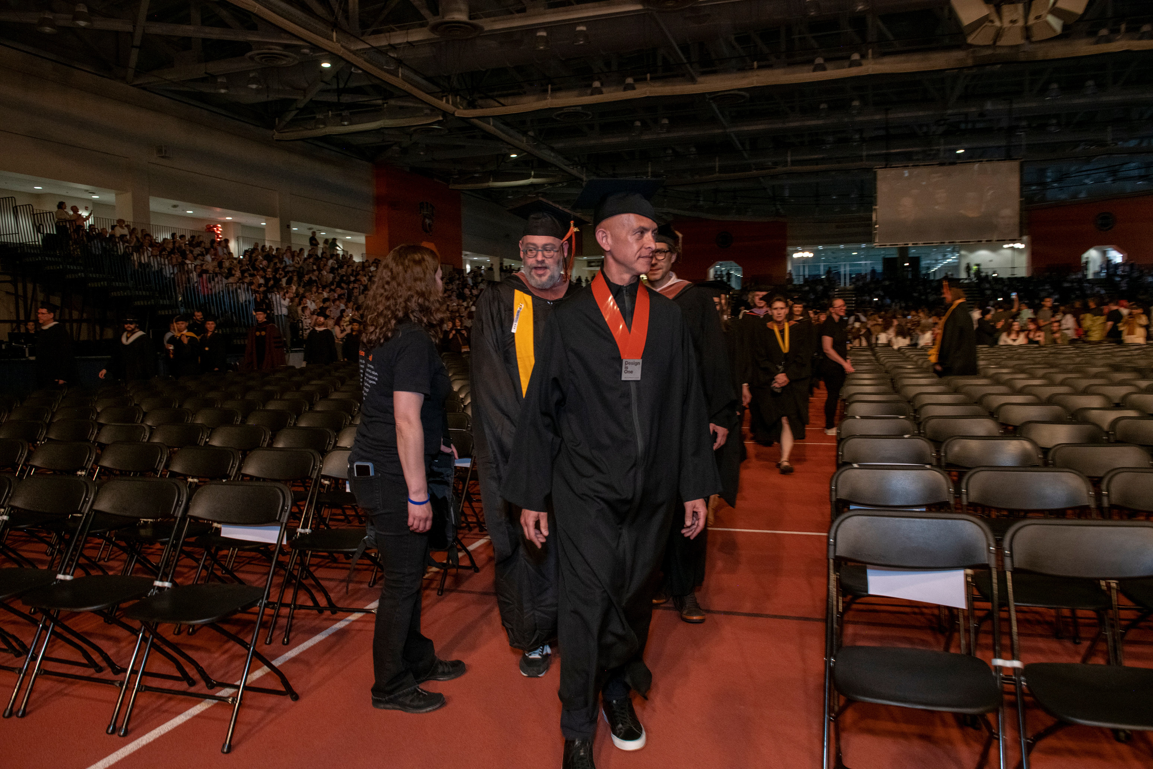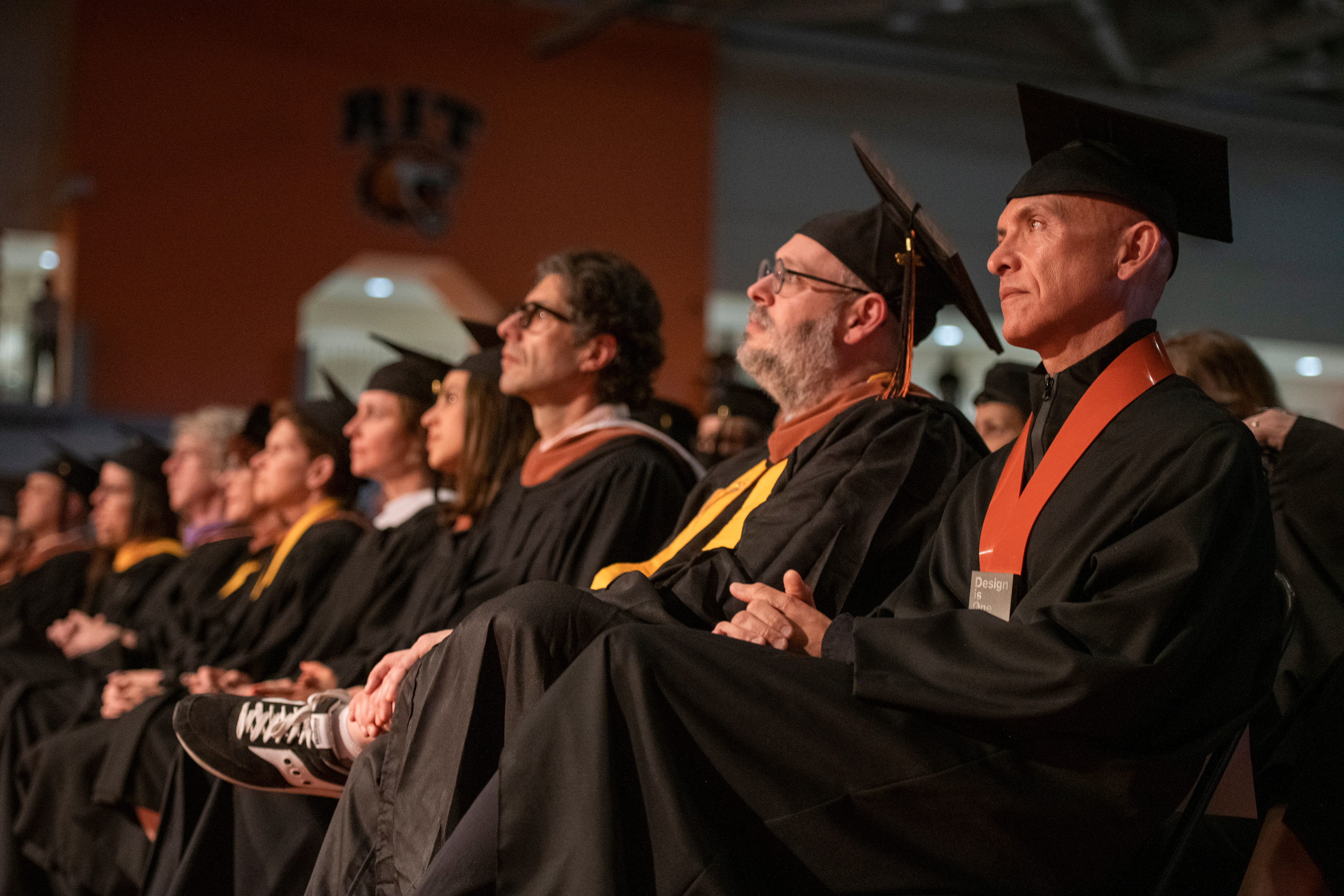 This project is the culmination of years-long talks between Melissa Dawson (Undergraduate Director of Industrial Design at Rochester Institute of Technology) and Josh Owen (Vignelli Distinguished Professor at RIT's Vignelli Center for Design Studies) about a collaborative project to redesign the traditional graduation gown based on research into the apparel studies of Lella and Massimo Vignelli, two world-renowned Italian designers whose archives are housed at RIT. Josh's position as the Vignelli Distinguished Professor and Melissa's expertise in textiles and apparel design made for a perfect pairing for the project. As a senior Industrial Design student and Melissa's classroom assistant, Clare Maxwell was asked to join the project in January 2023 to begin fittings and samples of the gown. The project went through four different fittings, pattern re-drafts, muslin samples, and fabric & finding experiments. The final regalia was finished and worn by Josh at the 2023 RIT Commencement ceremony.
