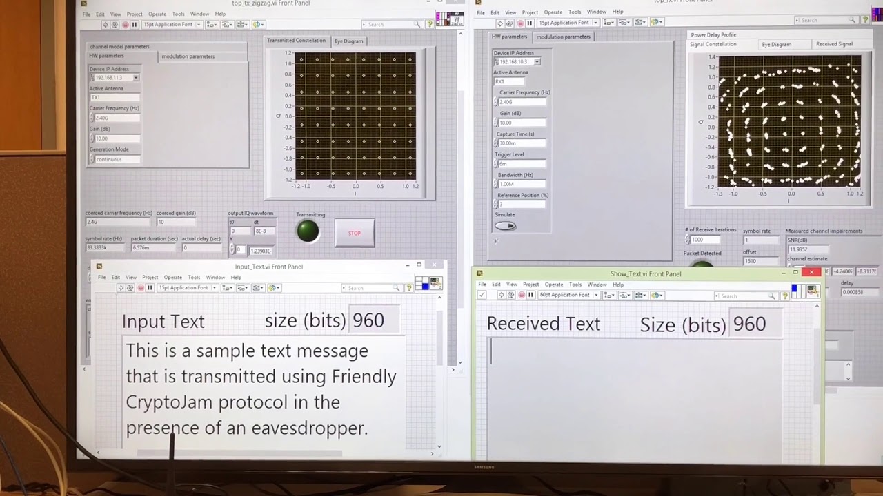 Demonstration of Friendly CryptoJam technique, developed first in 2014 and used for obfuscating the modulation scheme and encrypting the entire (PHY) frame to mitigate the leakage of side-channel information, among other things.